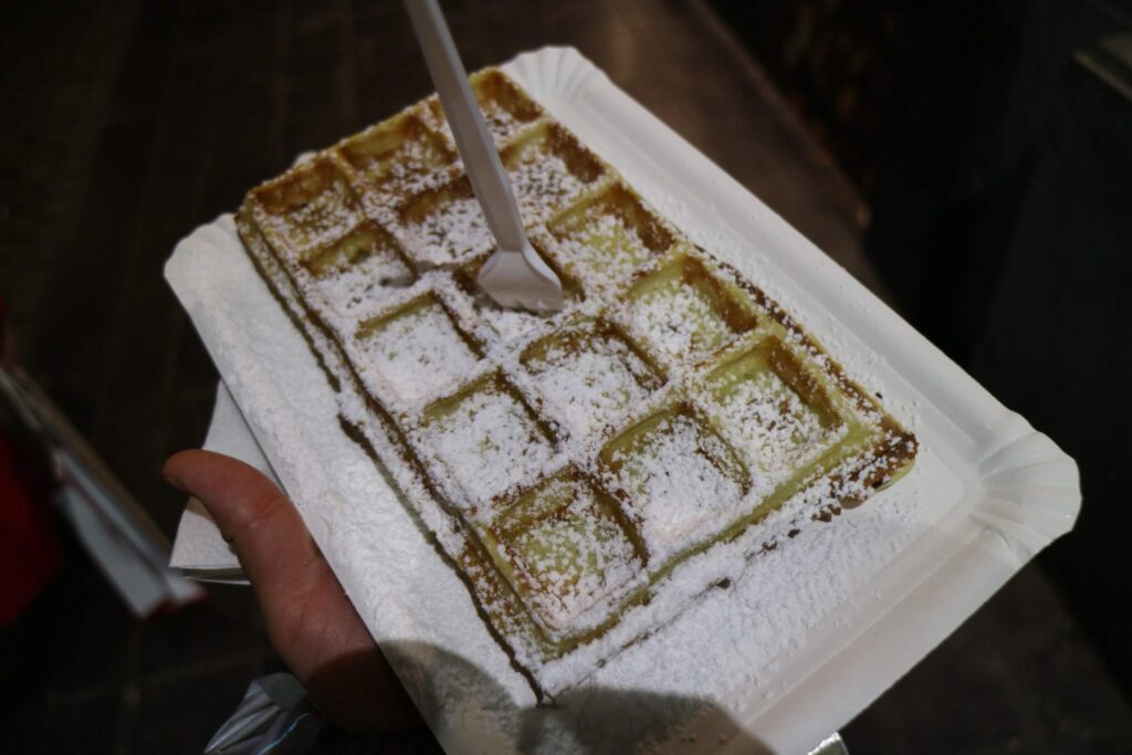 日本でも見かけるベルギーワッフルの形ですが、出来立てはモチモチでたまらない美味しさでした。
