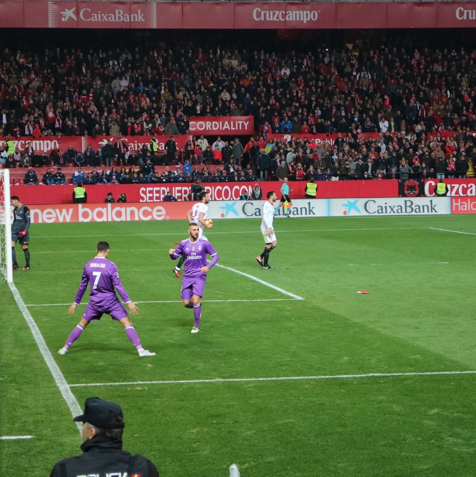 クリスティアーノロナウドがPKで先制し、レアルの勝利かと思われましたが、後半の試合終了間際にセビージャが2点返し、逆転勝利を飾り、会場は大盛り上がりでした。